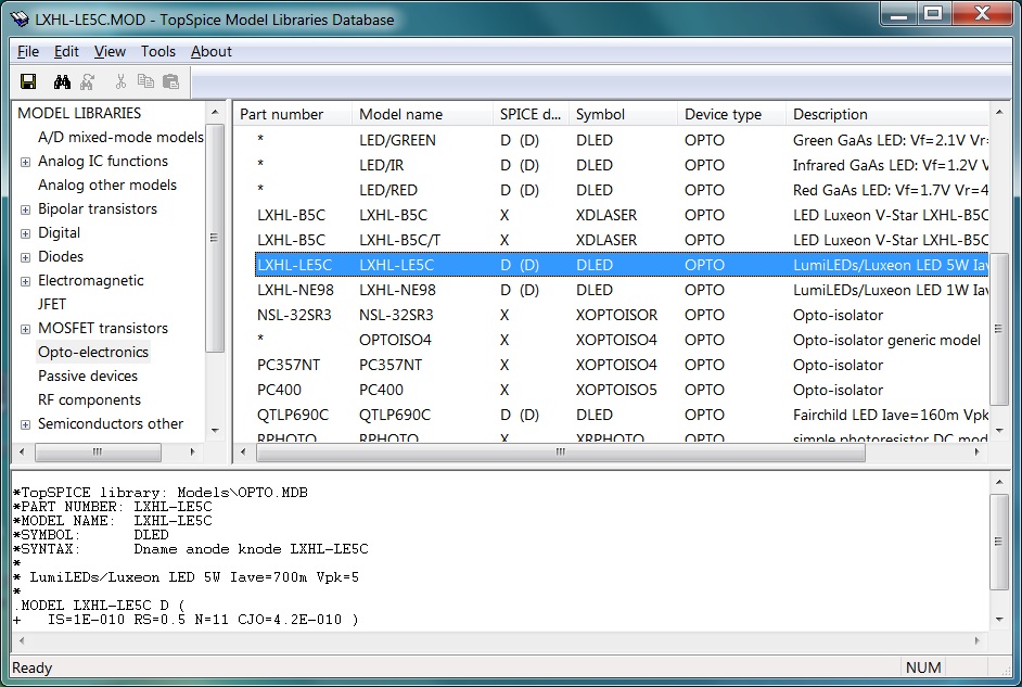 The model library includes discrete parts, analog IC parts, optoelectronic devices,, magnetic parts, digital logic families, power semiconductors, SMPS design models, cables, vacuum tubes, models from component vendors, and many more.